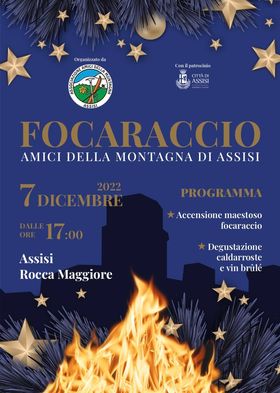 Da più di 60 anni all’imbrunire del 7 dicembre l’associazione Amici della Montagna di Assisi cura l’accensione del grande focaraccio in occasione della vigilia della festa dell’Immacolata. Il grande fuoco acceso sul piazzale della Rocca Maggiore di Assisi si rifà alle antiche tradizioni religiose che si svolgevano proprio l’8 dicembre. Una ricorrenza che gli Amici della Montagna di Assisi tramandano di padre in figlio, da socio anziano a socio giovane, mettendoci sacrificio ed impegno.