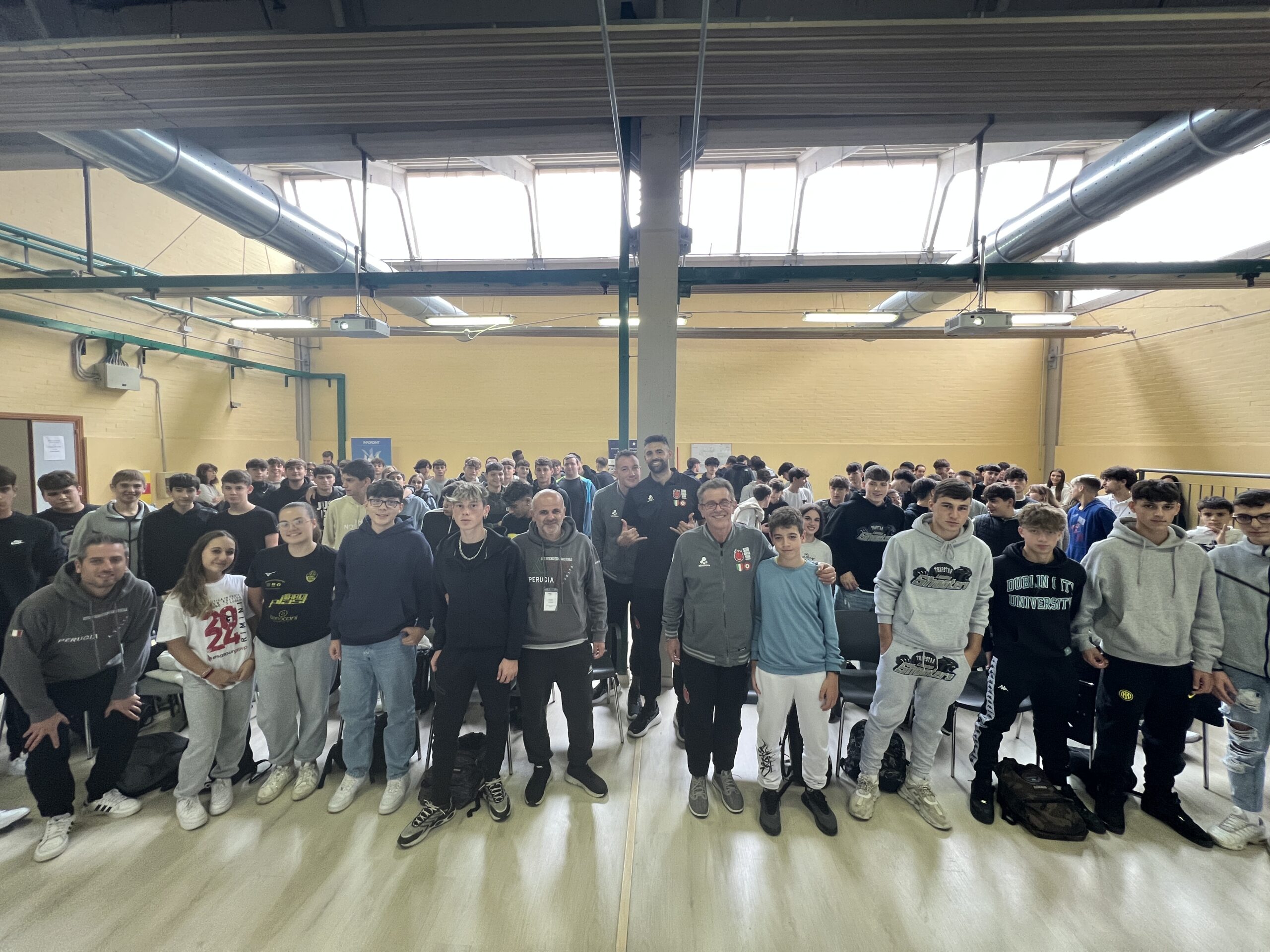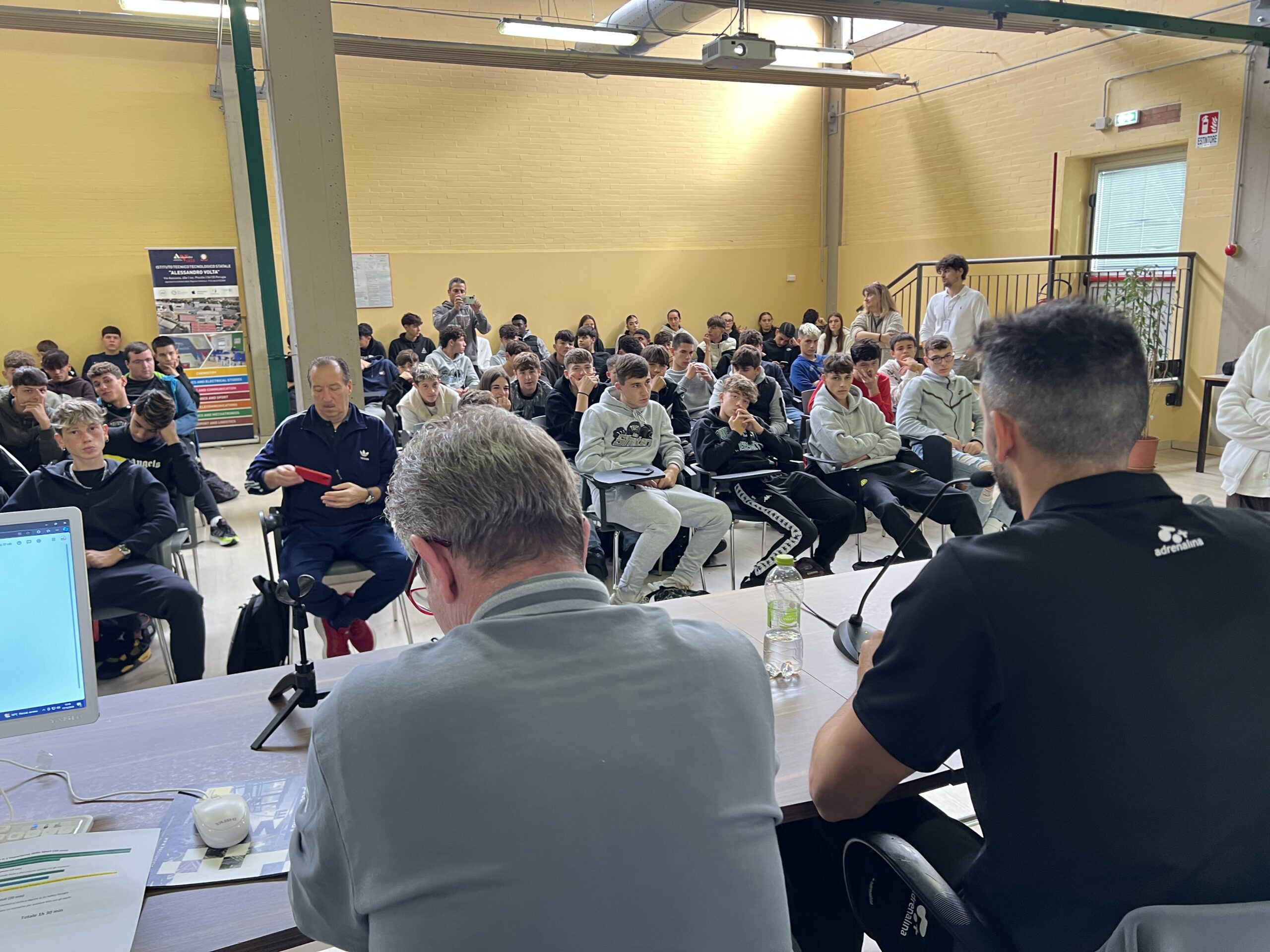 Un’aula magna gremita e attenta e dei “docenti d’eccezione”, a cominciare da coach Angelo Lorenzetti, insieme al centrale Sebastian Solè e allo schiacciatore Oleh Plotnytskyi. L’incontro è stato suddiviso in tre sessioni: la prima ha riguardato “Storia e valori della Sir Volley”, un focus particolarmente interessante per i ragazzi che, attraverso le parole di coach Lorenzetti, hanno potuto conoscere e ripercorrere le tappe salienti della storia della squadra e dei suoi successi, anche attraverso dei video di presentazione.