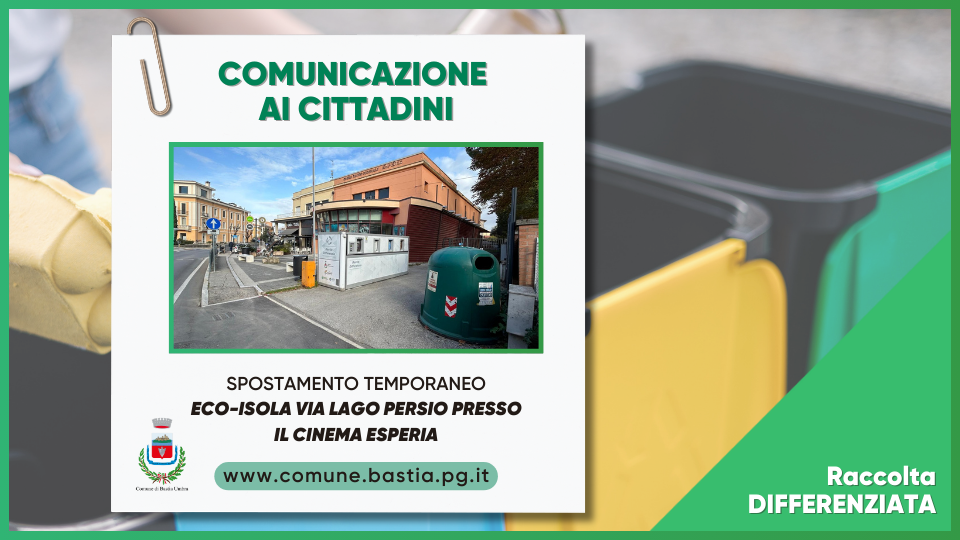 Si comunica ai cittadini che, in concomitanza del proseguimento del cantiere di Piazza Mazzini, l’Eco-Isola situata in Via Lago Persio è temporaneamente spostata presso il Cinema Esperia.
