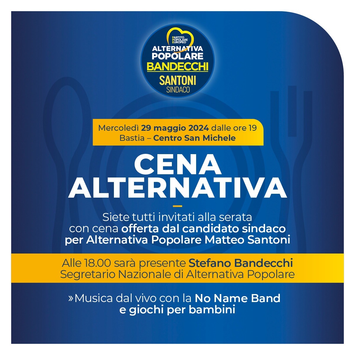 Mercoledì 29 maggio dalle 19, è prevista una cena alternativa offerta dal candidato Sindaco per