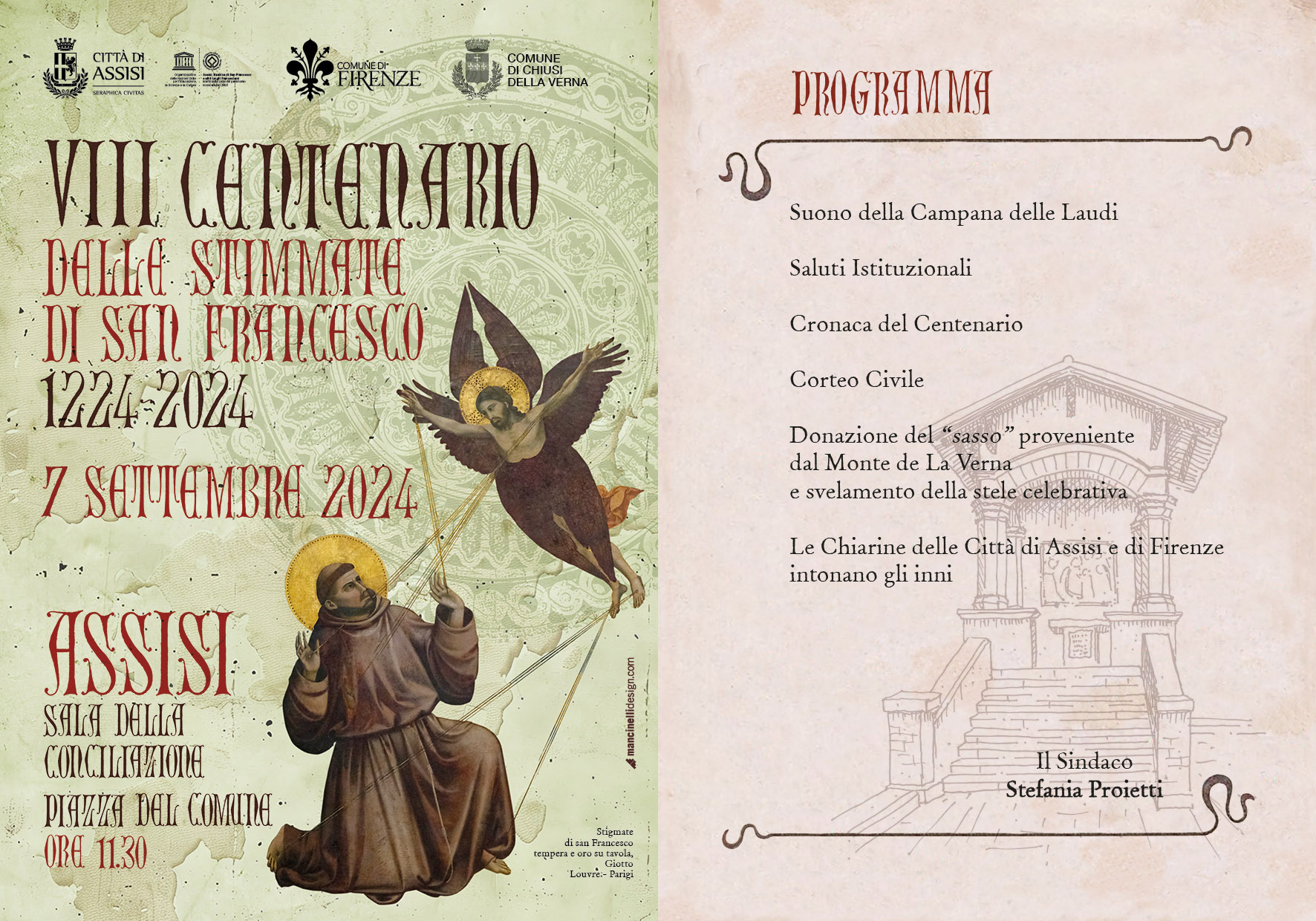 La Città di Assisi, nell’ambito delle celebrazioni per l’ottavo centenario francescano, intende rievocare l’anniversario delle Stimmate che San Francesco ricevette sul monte della Verna, nel mese di settembre del 1224.