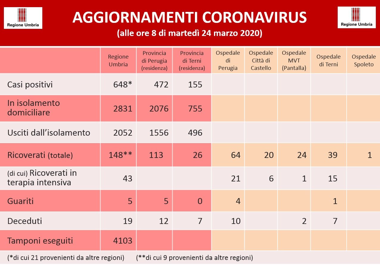 Coronavirus, dati aggiornati al 24 marzo della Regione Umbria