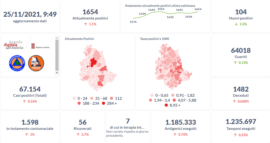 Covid-19 e vaccini, i dati aggiornati al 25 novembre della Regione Umbria.