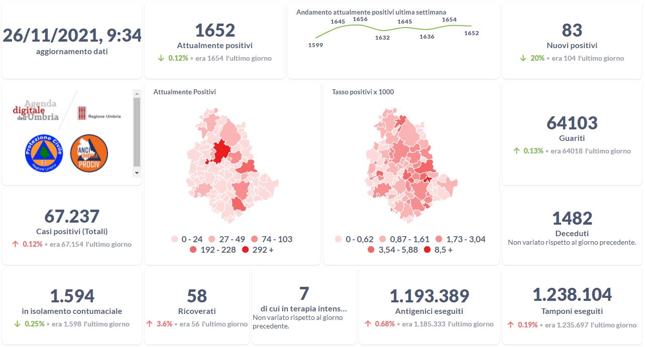Covid-19 e vaccini, i dati aggiornati al 26 novembre della Regione Umbria.