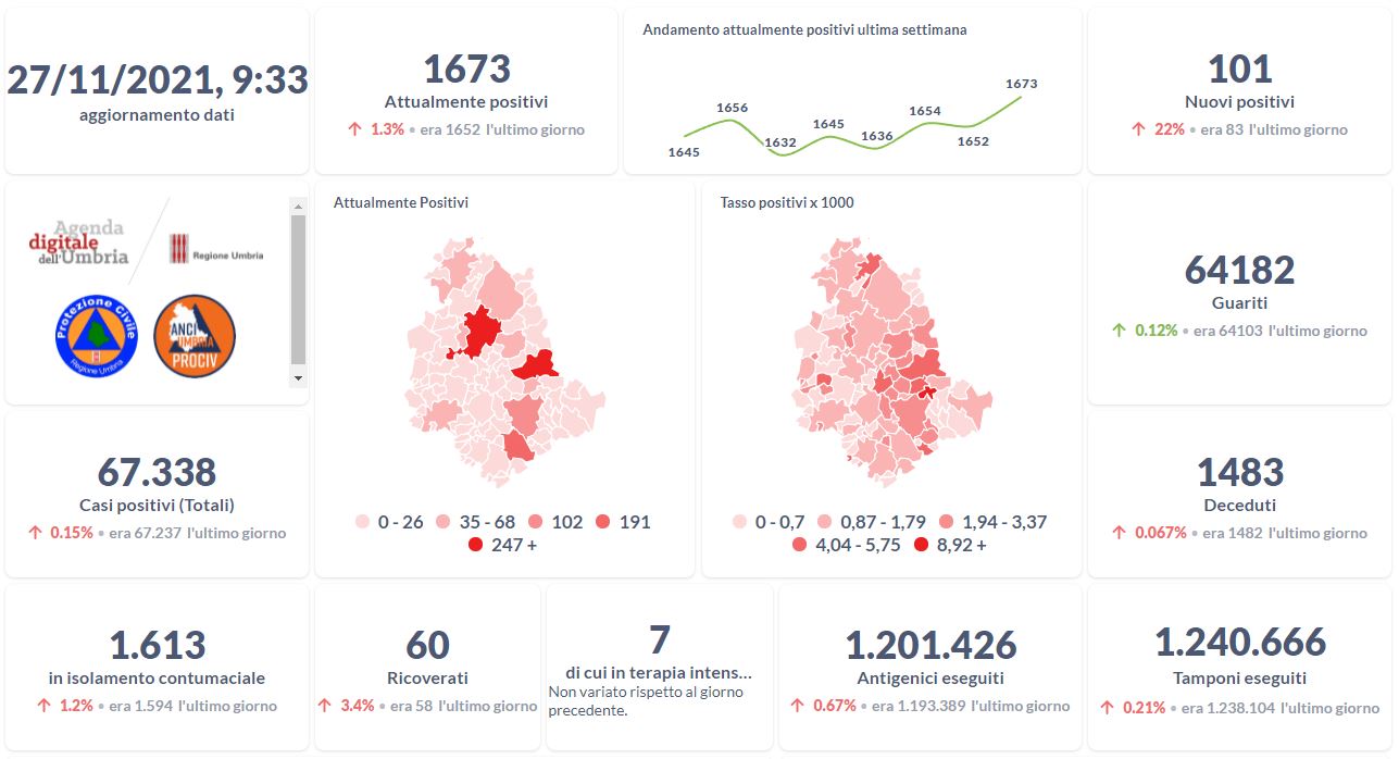 Covid-19 e vaccini, i dati aggiornati al 27 novembre della Regione Umbria.
