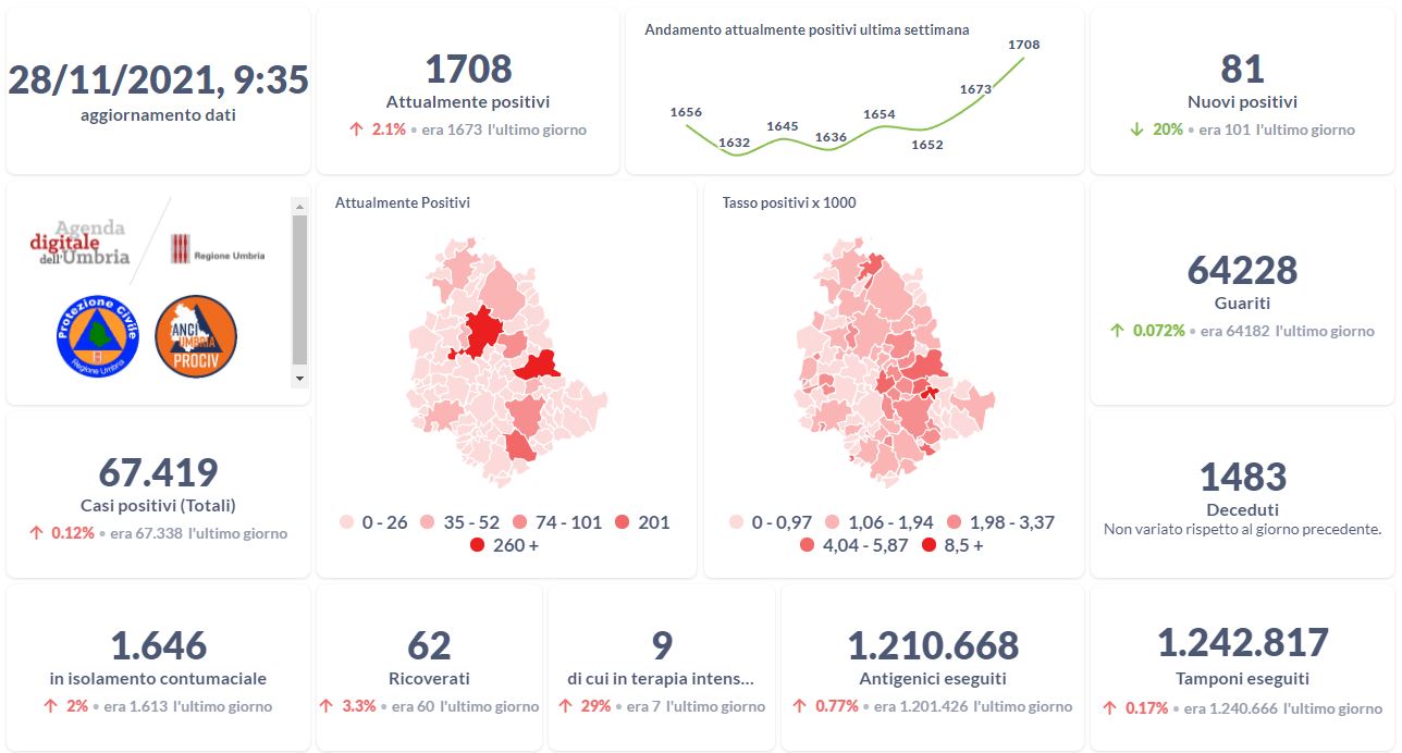 Covid-19 e vaccini, i dati aggiornati al 28 novembre della Regione Umbria.