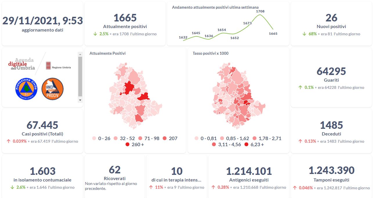 Covid-19 e vaccini, i dati aggiornati al 29 novembre della Regione Umbria.
