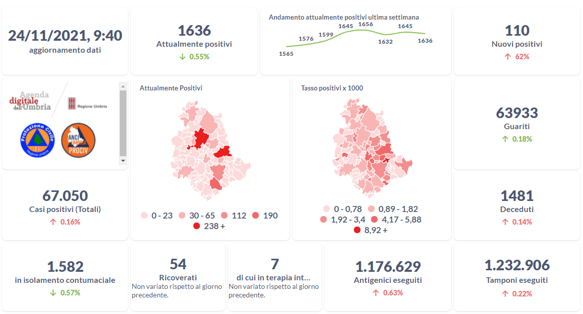 Covid-19 e vaccini, i dati aggiornati al 24 novembre della Regione Umbria.