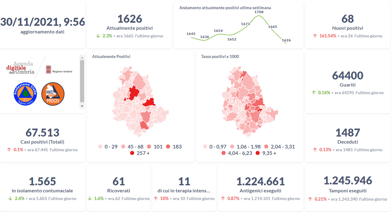 Covid-19 e vaccini, i dati aggiornati al 30 novembre della Regione Umbria.