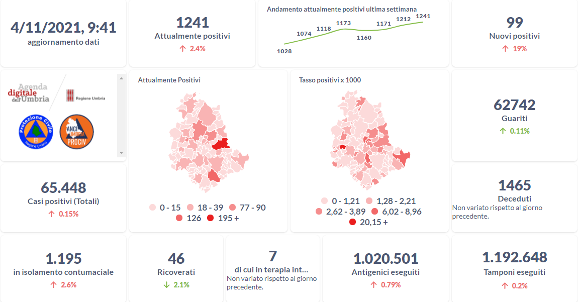 Covid-19 e vaccini, i dati aggiornati al 4 novembre della Regione Umbria.