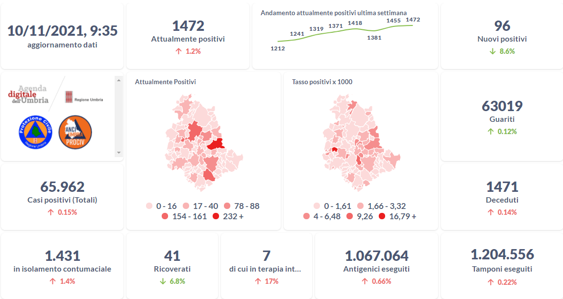 Covid-19 e vaccini, i dati aggiornati al 10 novembre della Regione Umbria.
