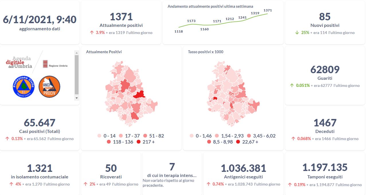 Covid-19 e vaccini, i dati aggiornati al 6 novembre della Regione Umbria.