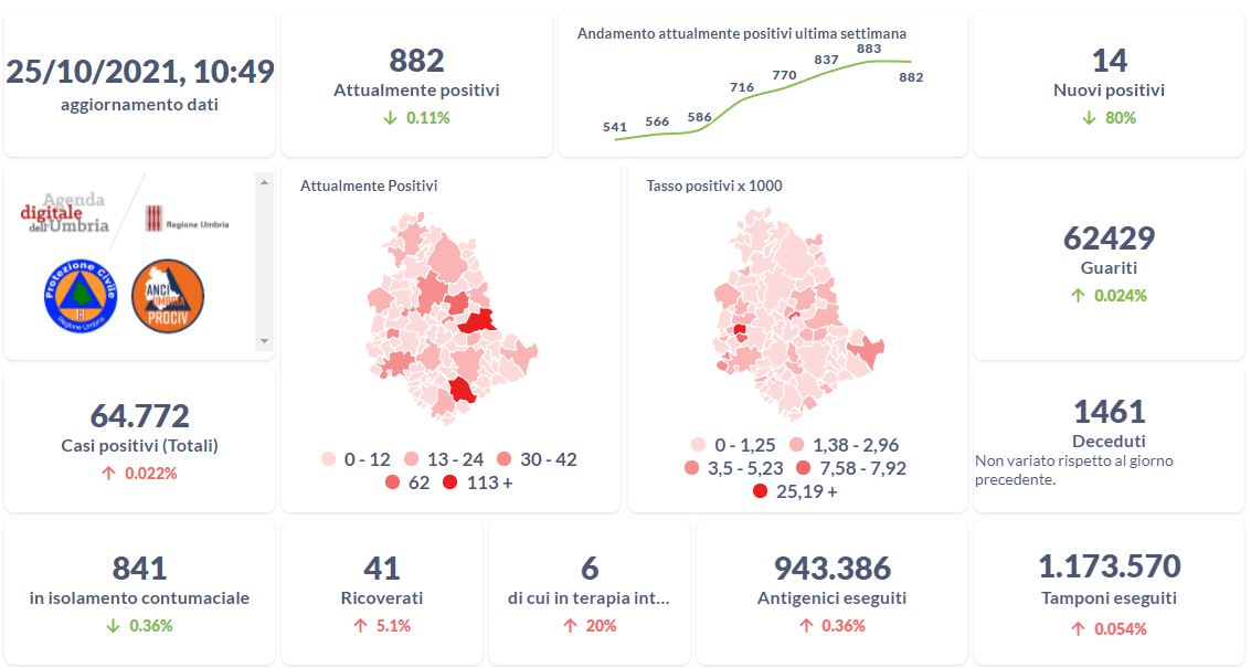 Covid-19 e vaccini, i dati aggiornati al 25 ottobre della Regione Umbria.