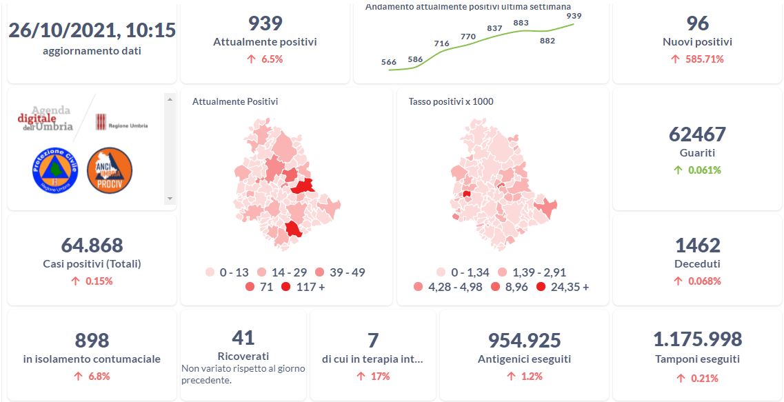 Dai dati aggiornati alle ore 10:15 di oggi 26 ottobre, 64.868 persone in Umbria risultano in totale positive al virus (+96 rispetto a ieri), gli attualmente positivi sono 939 (+57 rispetto a ieri), i guariti sono 62.467 (+38 rispetto a ieri). I deceduti sono 1.462 (+1 rispetto a ieri). Sono 41 i ricoverati (+0 rispetto a ieri) di cui 7 …