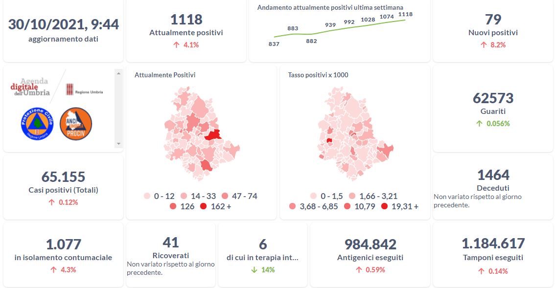 Dai dati aggiornati alle ore 09:44 di oggi 30 ottobre, 65.155 persone in Umbria risultano in totale positive al virus (+79 rispetto a ieri), gli attualmente positivi sono 1.118 (+44 rispetto a ieri), i guariti sono 62.573 (+35 rispetto a ieri). I deceduti sono 1.464 (+0 rispetto a ieri). Sono 41 i ricoverati (+0 rispetto a ieri) di cui 6 …
