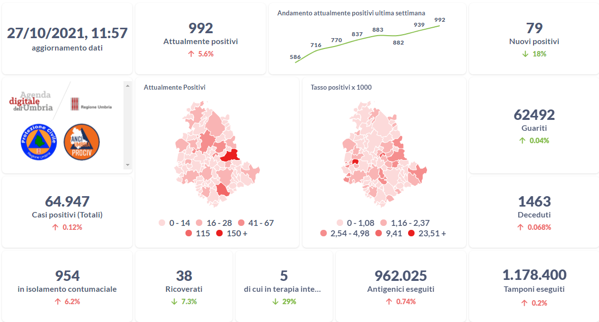 Covid-19 e vaccini, i dati aggiornati al 27 ottobre della Regione Umbria.