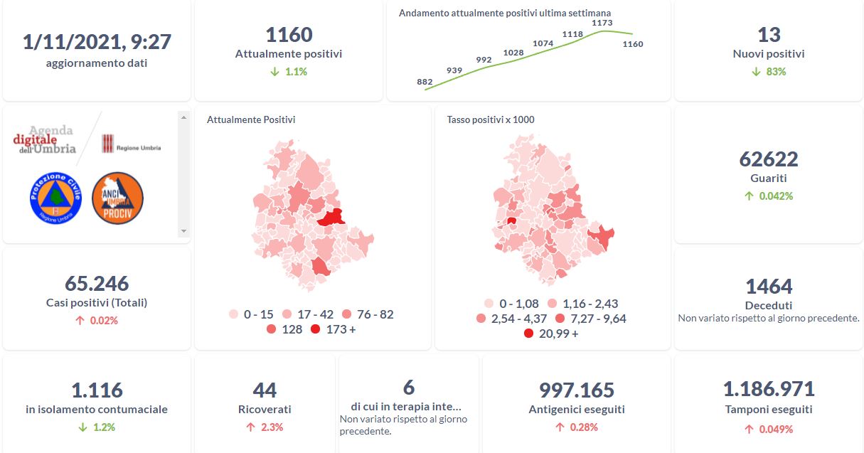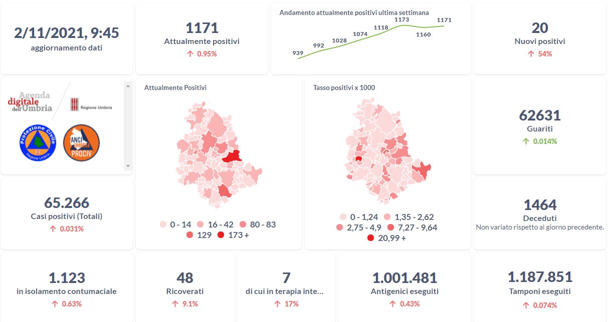 Dai dati aggiornati alle ore 09:45 di oggi 2 novembre, 65.266 persone in Umbria risultano in totale positive al virus (+20 rispetto a ieri), gli attualmente positivi sono 1.171 (+11 rispetto a ieri), i guariti sono 62.631 (+9 rispetto a ieri). I deceduti sono 1.464 (+0 rispetto a ieri). Sono 48 i ricoverati (+4 rispetto a ieri) di cui 7 …