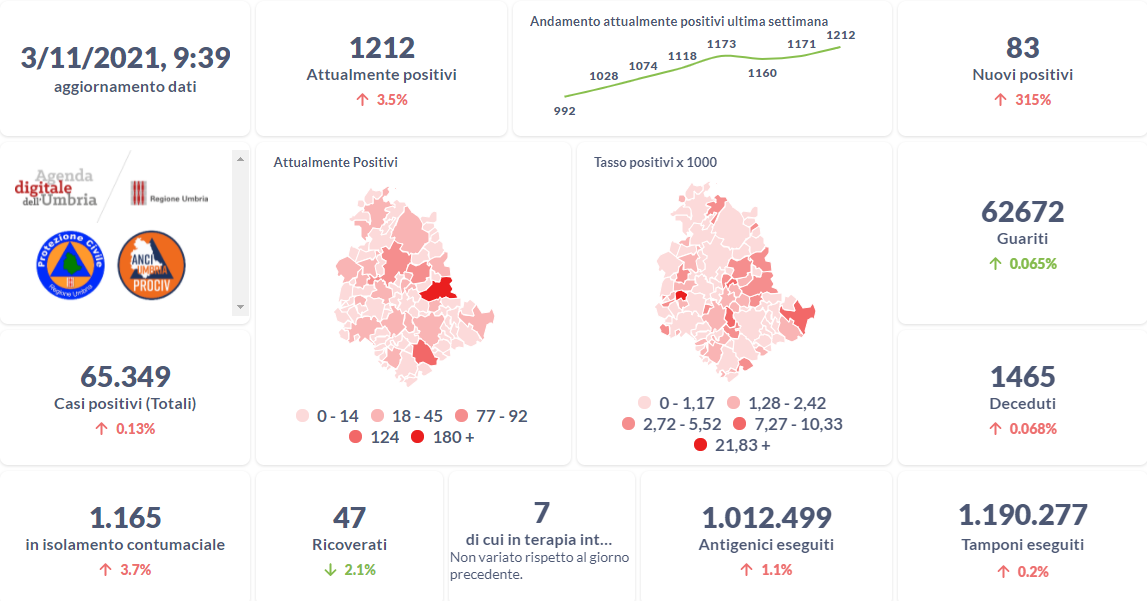 Dai dati aggiornati alle ore 09:39 di oggi 2 novembre, 65.349 persone in Umbria risultano in totale positive al virus (+83 rispetto a ieri), gli attualmente positivi sono 1.212 (+41 rispetto a ieri), i guariti sono 62.672 (+41 rispetto a ieri). I deceduti sono 1.465 (+1 rispetto a ieri). Sono 47 i ricoverati (-1 rispetto a ieri) di cui 7 …