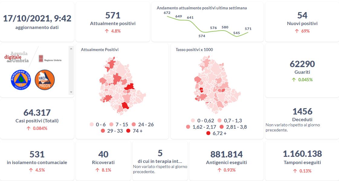 Dai dati aggiornati alle ore 09:42 di oggi 17 ottobre, 64.317 persone in Umbria risultano in totale positive al virus (+54 rispetto a ieri), gli attualmente positivi sono 571 (+26 rispetto a ieri), i guariti sono 62.290 (+28 rispetto a ieri). I deceduti sono 1.456 (+0 rispetto a ieri). Sono 40 i ricoverati (+3 rispetto a ieri) di cui 5 …
