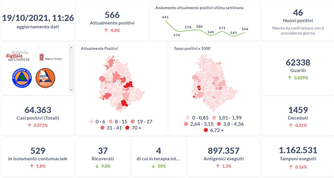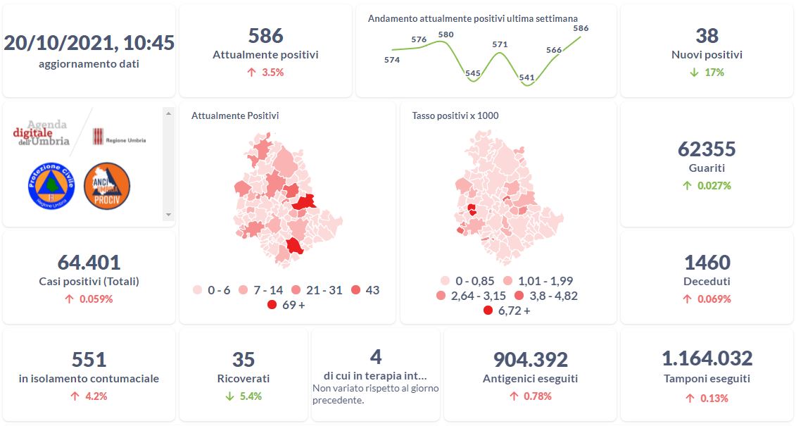 Dai dati aggiornati alle ore 10:45 di oggi 20 ottobre, 64.401 persone in Umbria risultano in totale positive al virus (+38 rispetto a ieri), gli attualmente positivi sono 586 (+20 rispetto a ieri), i guariti sono 62.355 (+17 rispetto a ieri). I deceduti sono 1.460 (+1 rispetto a ieri). Sono 35 i ricoverati (-2 rispetto a ieri) di cui 4 …