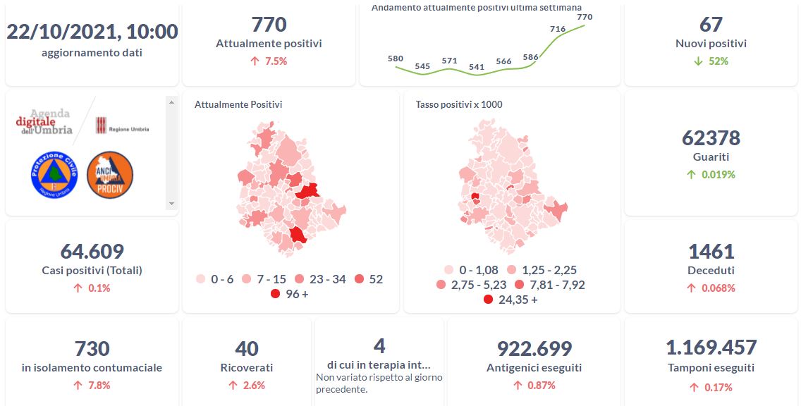 Dai dati aggiornati alle ore 10:00 di oggi 22 ottobre, 64.609 persone in Umbria risultano in totale positive al virus (+67 rispetto a ieri), gli attualmente positivi sono 770 (+54 rispetto a ieri), i guariti sono 62.378 (+12 rispetto a ieri). I deceduti sono 1.461 (+1 rispetto a ieri). Sono 40 i ricoverati (+1 rispetto a ieri) di cui 4 …
