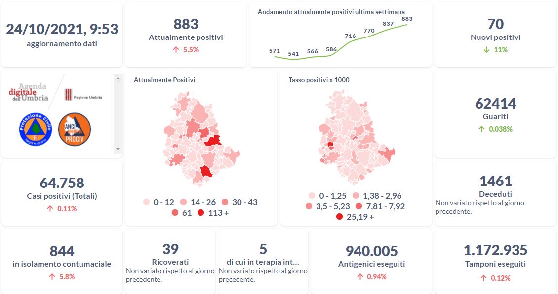 Dai dati aggiornati alle ore 09:53 di oggi 24 ottobre, 64.758 persone in Umbria risultano in totale positive al virus (+70 rispetto a ieri), gli attualmente positivi sono 883 (+46 rispetto a ieri), i guariti sono 62.414 (+24 rispetto a ieri). I deceduti sono 1.461 (+0 rispetto a ieri). Sono 39 i ricoverati (+0 rispetto a ieri) di cui 5 …