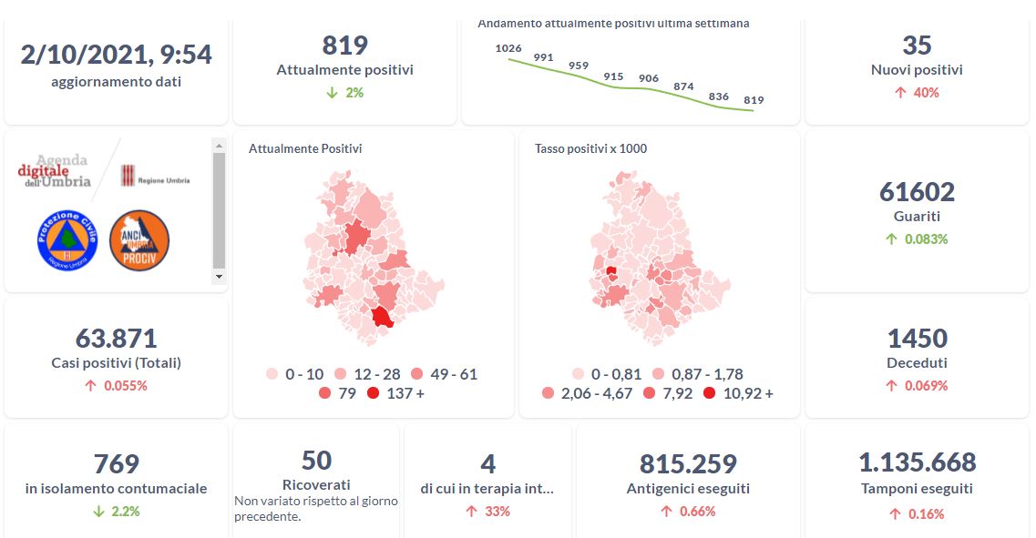 Covid-19 e vaccini, i dati aggiornati al 2 ottobre della Regione Umbria.