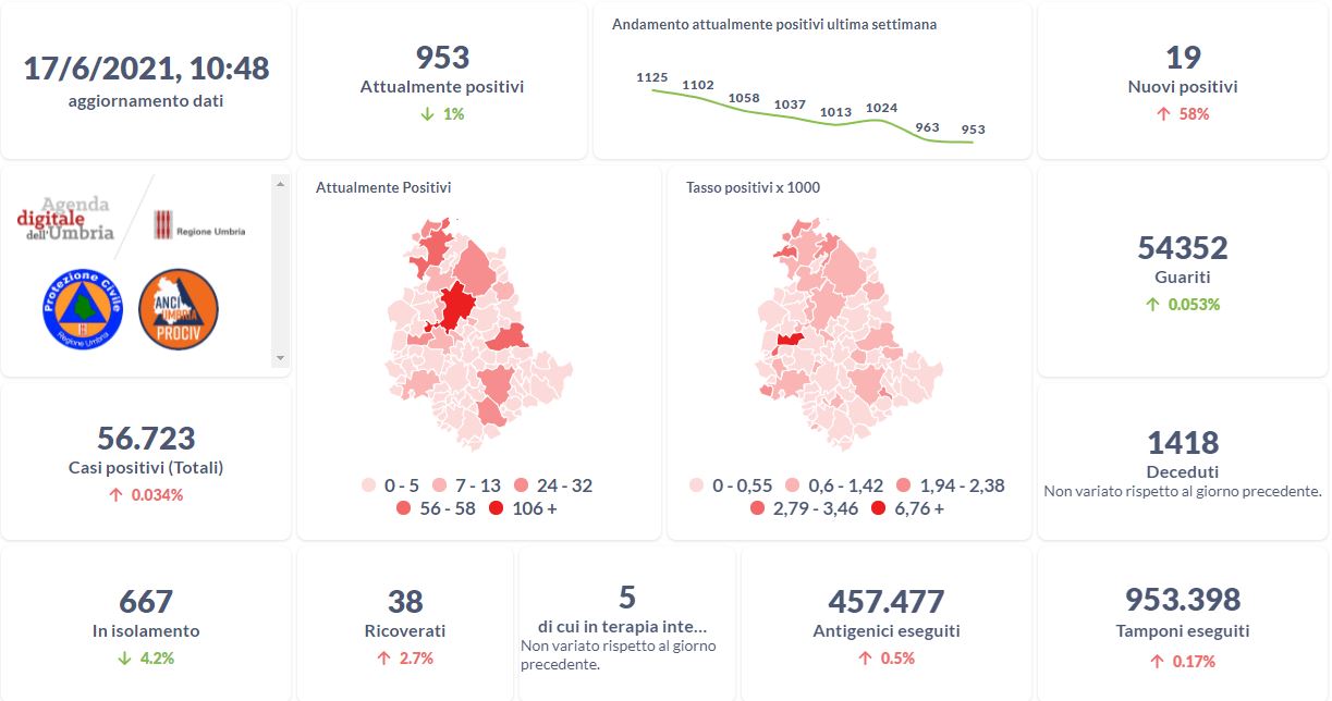 Coronavirus, i dati aggiornati al 16 giugno della Regione Umbria.