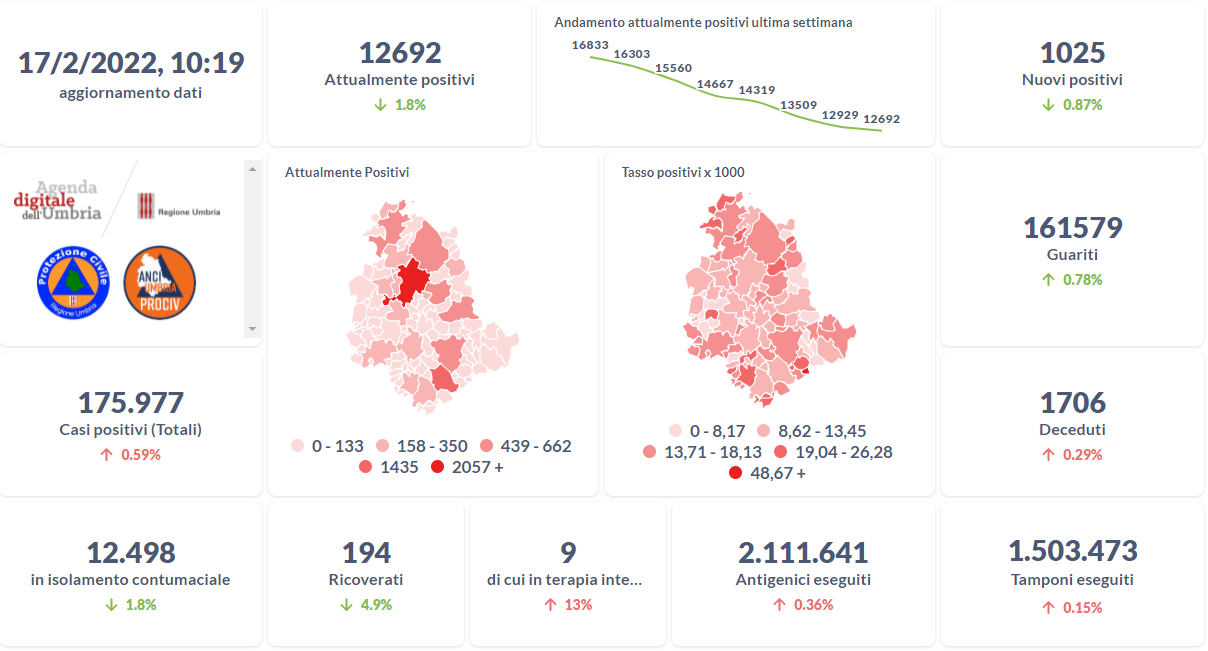 Dai dati aggiornati alle ore 10:19 di oggi 17 febbraio, 175.977 persone in Umbria risultano in totale positive al virus (+1.025 rispetto a ieri), gli attualmente positivi sono 12.692 (-237 rispetto a ieri), i guariti sono 161.579 (+1.257 rispetto a ieri). I deceduti sono 1.706 (+5 rispetto a ieri). Sono 194 i ricoverati (-10 rispetto a ieri) di cui 9 …