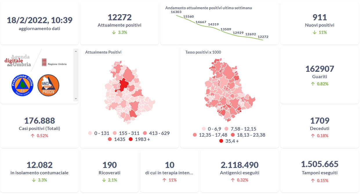 Dai dati aggiornati alle ore 11:23 di oggi 15 febbraio, 173.918 persone in Umbria risultano in totale positive al virus (+1.009 rispetto a ieri), gli attualmente positivi sono 13.509 (-810 rispetto a ieri), i guariti sono 158.712 (+1.814 rispetto a ieri). I deceduti sono 1.697 (+5 rispetto a ieri). Sono 211 i ricoverati (+1 rispetto a ieri) di cui 7 …