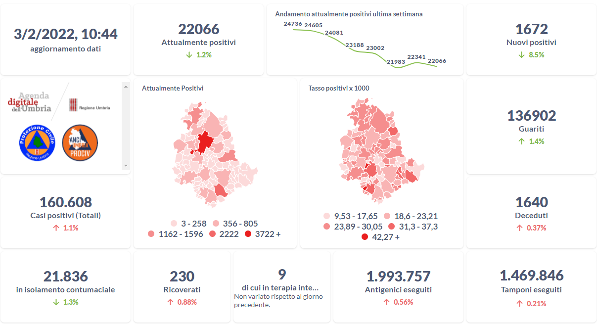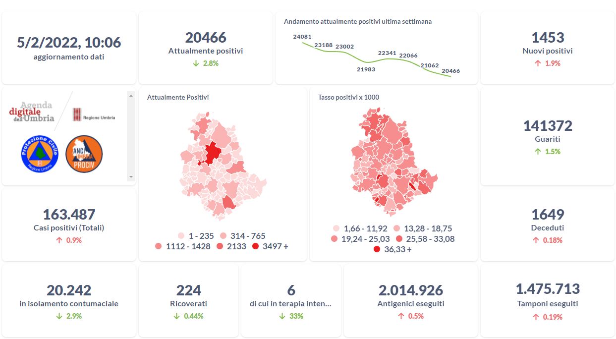 Dai dati aggiornati alle ore 10:06 di oggi 5 febbraio, 163.487 persone in Umbria risultano in totale positive al virus (+1.453 rispetto a ieri), gli attualmente positivi sono 20.466 (-596 rispetto a ieri), i guariti sono 141.372 (+2.046 rispetto a ieri). I deceduti sono 1.643 (+3 rispetto a ieri). Sono 224 i ricoverati (-1 rispetto a ieri) di cui 6 …