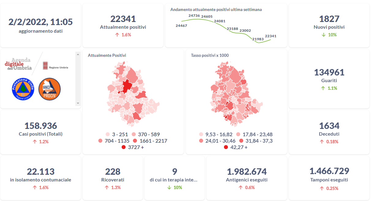 Dai dati aggiornati alle ore 11:25 di oggi 2 febbraio, 158.936 persone in Umbria risultano in totale positive al virus (+1.827 rispetto a ieri), gli attualmente positivi sono 22.341 (+358 rispetto a ieri), i guariti sono 134.961 (+1.466 rispetto a ieri). I deceduti sono 1.634 (+3 rispetto a ieri). Sono 228 i ricoverati (+3 rispetto a ieri) di cui 9 …