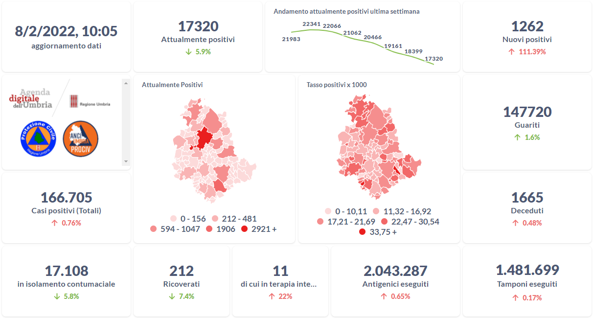 Dai dati aggiornati alle ore 10:05 di oggi 8 febbraio, 166.705 persone in Umbria risultano in totale positive al virus (+1.262 rispetto a ieri), gli attualmente positivi sono 17.320 (-1.079 rispetto a ieri), i guariti sono 147.720 (+2.333 rispetto a ieri). I deceduti sono 1.665 (+8 rispetto a ieri). Sono 212 i ricoverati (-17 rispetto a ieri) di cui 11 …