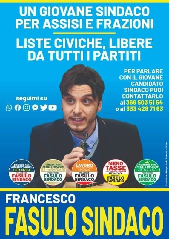 Amministrative 2021 Assisi, FRANCESCO FASULO SINDACO L’ AMORE PER ASSISI E FRAZIONI: 1) MASSIMILIANO CASTELLANI 2) ELISA CASTELLANI 3) EUGENIO BIGINI 4) GIUSEPPINA CIRENEI 5) FRANCESCO LO CASCIO 6) MARIAROSARIA CAPPIELLO 7) ALESSANDRO ACCIARINO 8) LEONARDA GRAVINA 9) PAOLO POZZI 10) GIANCARLO FARAGLIA 11) PAOLA PUCCIARINI GIOVANI PER ASSISI E FRAZIONI: 1) GAETANO MOLLO 2) MARIA PIA CATANZARITI 3) GIOVANNI …