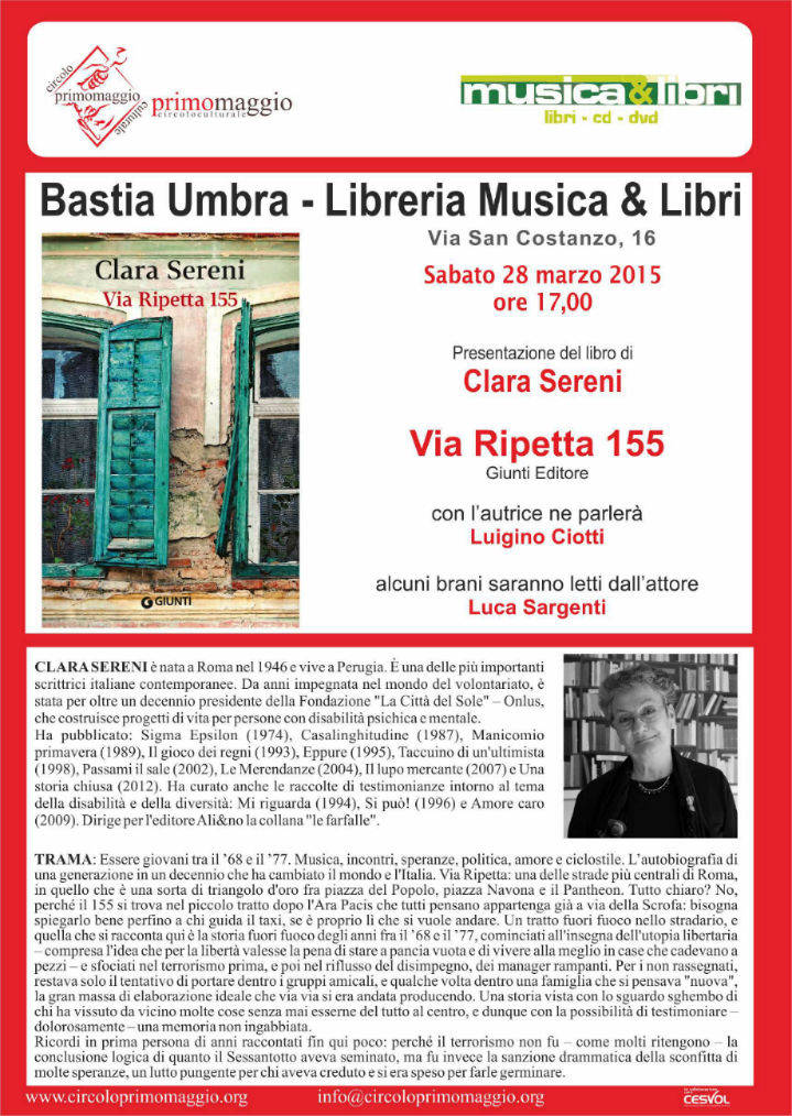 Proseguiremo sabato 28 marzo, ore 17.00, a Bastia Umbra (vedi locandina allegata ed altre notizie sotto)c/o Libreria Musica&Libri con la presentazione del nuovo libro di Clara Sereni (Giunti editore) “Via Ripetta 155” e con l’autrice ne parlerà Luigino Ciotti e brani letti da Luca sargenti.