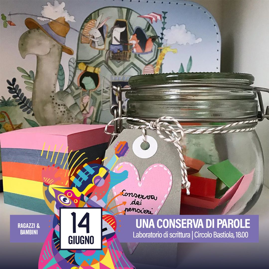LABORATORIO DI SCRITTURA: UNA CONSERVA DI PAROLE dalle 18:00  presso il Circolo di Bastiola. A cura di FARE cooperativa sociale e dell’insegnate e illustratrice Sabina Antonelli. Il Caviardage è un metodo di scrittura creativa, che fa emergere il poeta nascosto in ognuno di noi. Attraverso varie tecniche ogni bambino realizzerà il proprio pensiero poetico che verrà conservato nel “barattolo della felicità”. Il tutto verrà coordinato da Sabina Antonelli, insegnante, autrice di libri per bambini, illustratrice e formatrice del Metodo Caviardage di Tina Festa.