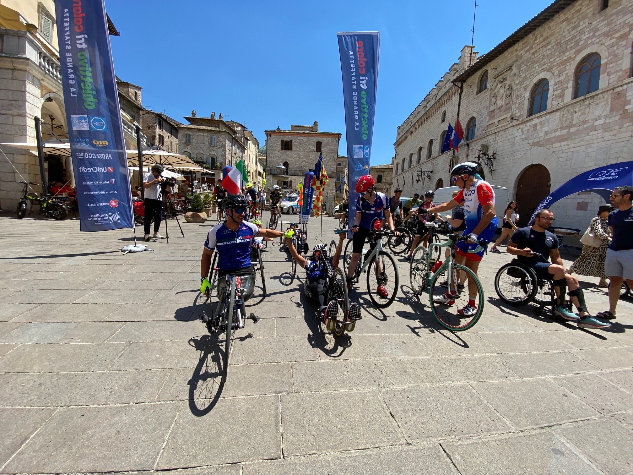 In Piazza del Comune gli atleti sono arrivati intorno alle 13 e sono stati accolti dal sindaco che dopo aver rivolto loro i complimenti per l’impresa li ha salutati uno per uno dicendo che Assisi è onorata di ospitare Obiettivo Tricolore ed è orgogliosa della loro impresa, del loro impegno nello sport e nella vita.