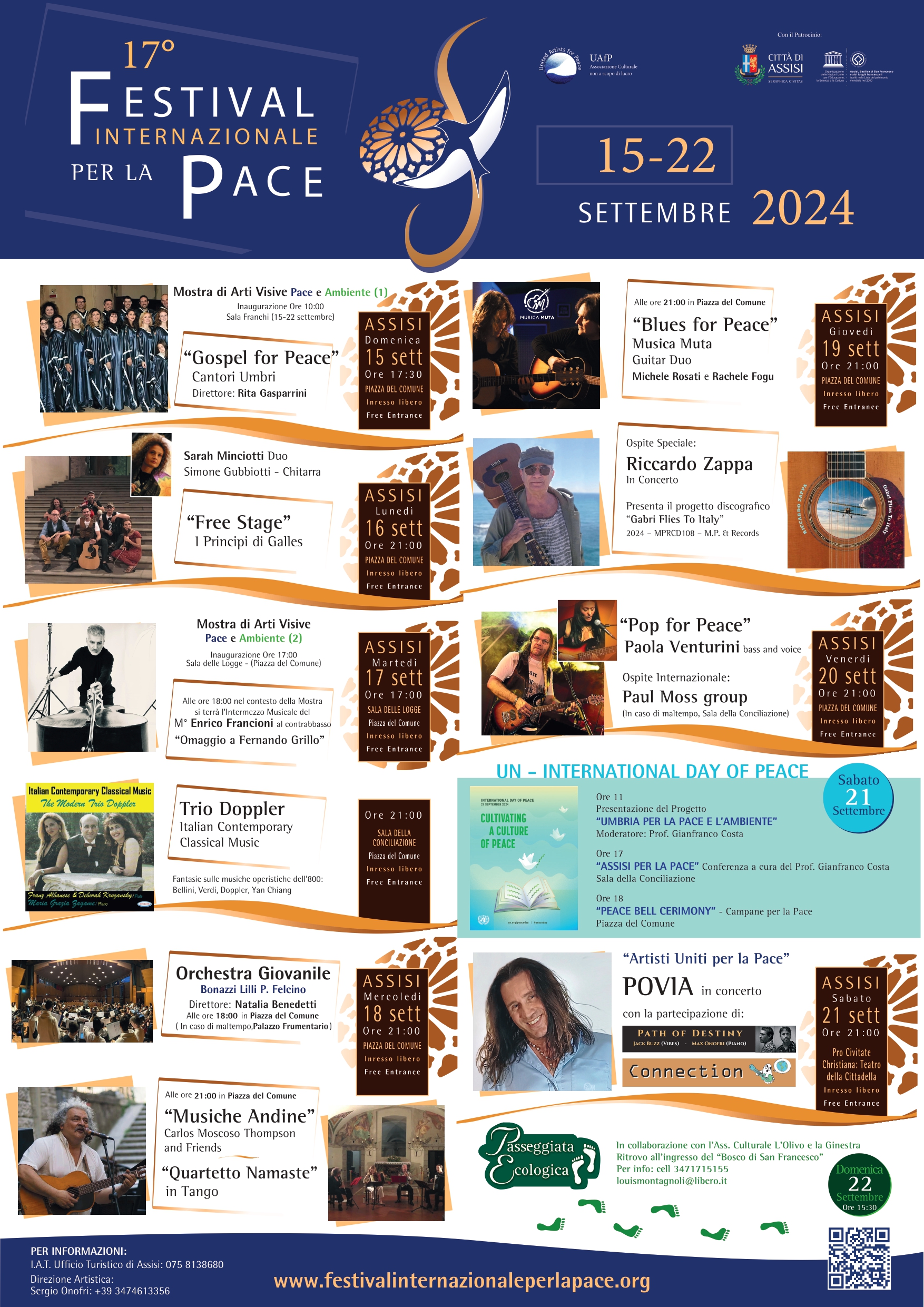 Si comincia dunque domenica con il Gospel For Peace dei Cantori Umbria diretto da Rita Gasperini; lunedì in programma il duo Sarah Minciotti-Simone Gubbiotti (voce e chitarra) interpreti di alcune composizioni di Sarah Minciotti nate dalla sua passata collaborazione con Youssou N’Dour, seguirà il “Free Stage dei Principi di Galles; martedì sarà la volta del Trio Doppler con fantasie sulle musiche operistiche dell’800: Bellini, Verdi, Doppler, Yan Chiang; mercoledì 18 il programma prevede il concerto dell’Orchestra Giovanile Bonazzi Lilli di Ponte Felcino del direttore Natalia Benedetti, e quindi Musiche Andine con Carlos Moscoso Thompson e Friends e il quartetto Namaste in Tango. Giovedì 19 un Blues for Peace con un duo di chitarre composto da Michele Rosati e Rachele Fogu, quindi l’ospite speciale Riccardo Zappa in concerto che presenterà il suo progetto “Gabri Flies To Italy”.Venerdì 20 Pop for Peace con Paola Venturini basso e voce con l’ospite internazionale Paul Moss Group.