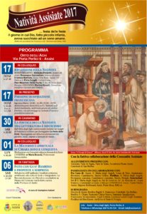 ASSISI – In prossimità del Santo Natale l’associazione Assisium curata da Giampiero Italiani con il patrocinio della diocesi di Assisi – Nocera Umbra – Gualdo Tadino, della Città di Assisi e di diverse altre realtà del territorio ripropone l’iniziativa natalizia, giunta alla seconda edizione, dal titolo “Natività Assisiate 2017”. Un vasto programma che prevede domenica 17 dicembre alle ore 17,30 nell’Orto degli Aghi di via Porta Perlici n. 6 ad Assisi un colloquio per riflettere sulla natività e l’inaugurazione del presepio di ispirazione francescana. Si tratta di una ambientazione domestica della Natività̀ nell’Assisi medievale, realizzata presso un antico fondaco, con personaggi in costumi d’epoca a grandezza naturale e corredo in Punto Assisi. L’iniziativa prosegue con un cammino sabato 30 dicembre alle ore 15 dall’Orto degli Aghi verso la casa di Santa Chiara (piazza San Rufino), la casa di Francesco (Chiesa Nuova), la Basilica di Santa Chiara fino al Santuario della Spogliazione dove i partecipanti saranno accolti dal vescovo. La passeggiata sarà accompagnata da letture e animazioni festanti attraverso giardini, vicoli, sagrati e Santuari nei luoghi di Francesco e Chiara. Lunedì 1 gennaio ci sarà la meditazione con alcune comunità religiose femminili di Assisi e sabato 6 gennaio dalle ore 10 alle ore 17 nel giorno dell’Epifania i bambini potranno avvicinarsi alla culla di Gesù e fare il loro selfie con Gesù Bambino. La Natività Assisiate dei Piccoli si concluderà in piazza del Comune con la festa curata dalla Pro Loco di Assisi.