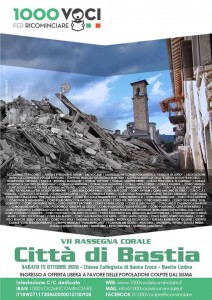 D’accordo con i cori ospiti , l’Ensemble Canto ergo sum di Spoleto e il Gruppo Corale Entropie Armoniche di Roma, e il loro direttori, Mauro Presazzi e Claudia Gili, il Coro Città di Bastia ha deciso di aderire al progetto nazionale “1000 voci per ricominciare”, che coinvolge quasi 80 formazioni di tutto il territorio nazionale. Il pubblico che lo desidera, potrà liberamente effettuare offerte che saranno convogliate su un obiettivo specifico, concordato con il sindaco di Amatrice.