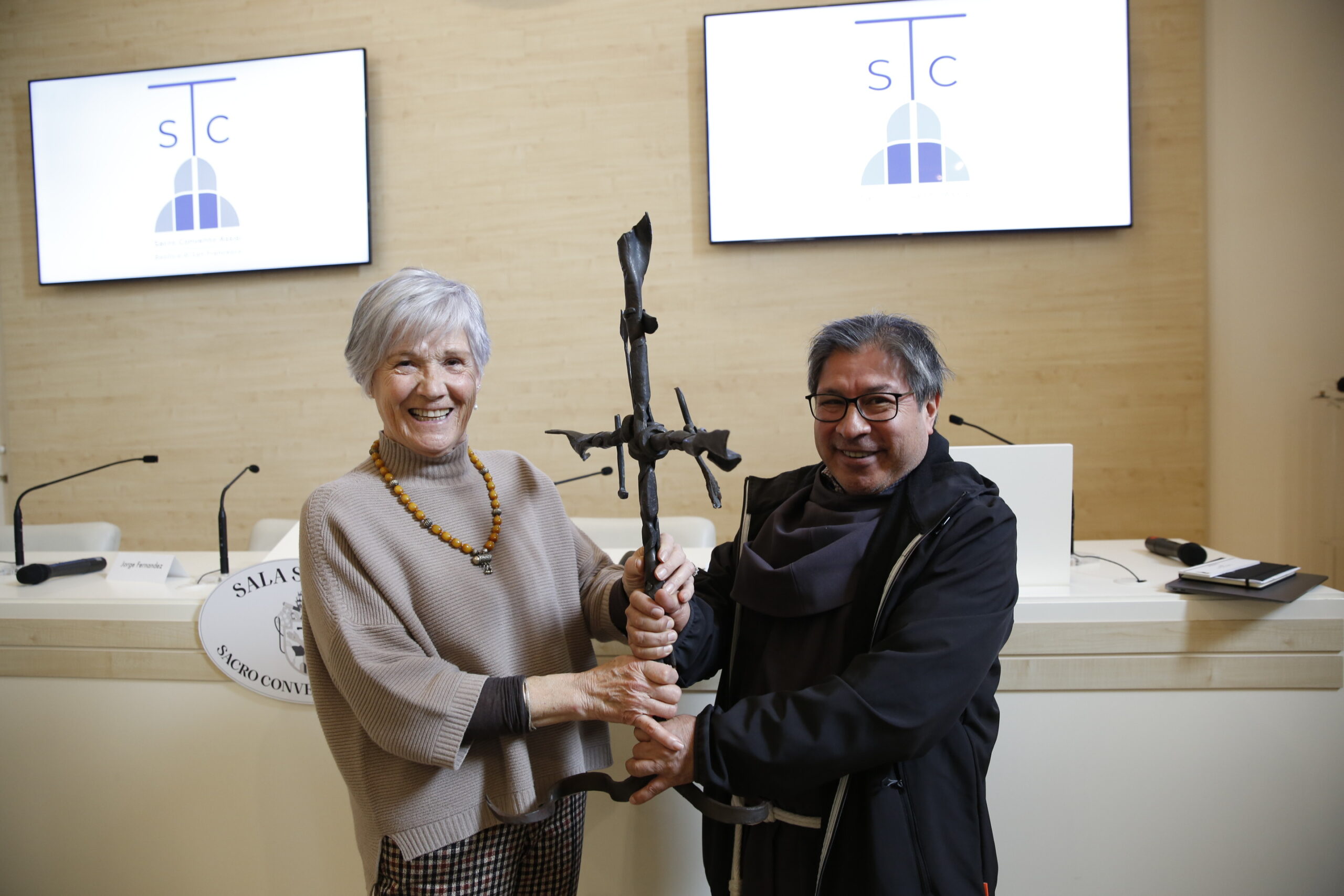 Alla fine dell’evento l’Associazione Cammini di Francesco del Casentino, nella persona di Olga Fiorini, segretaria, ha donato alla Statio Peregrinorum una croce in ferro battuto intitolata “Crocifissione” dell’artista Fiorello Del Santo del 2005.
