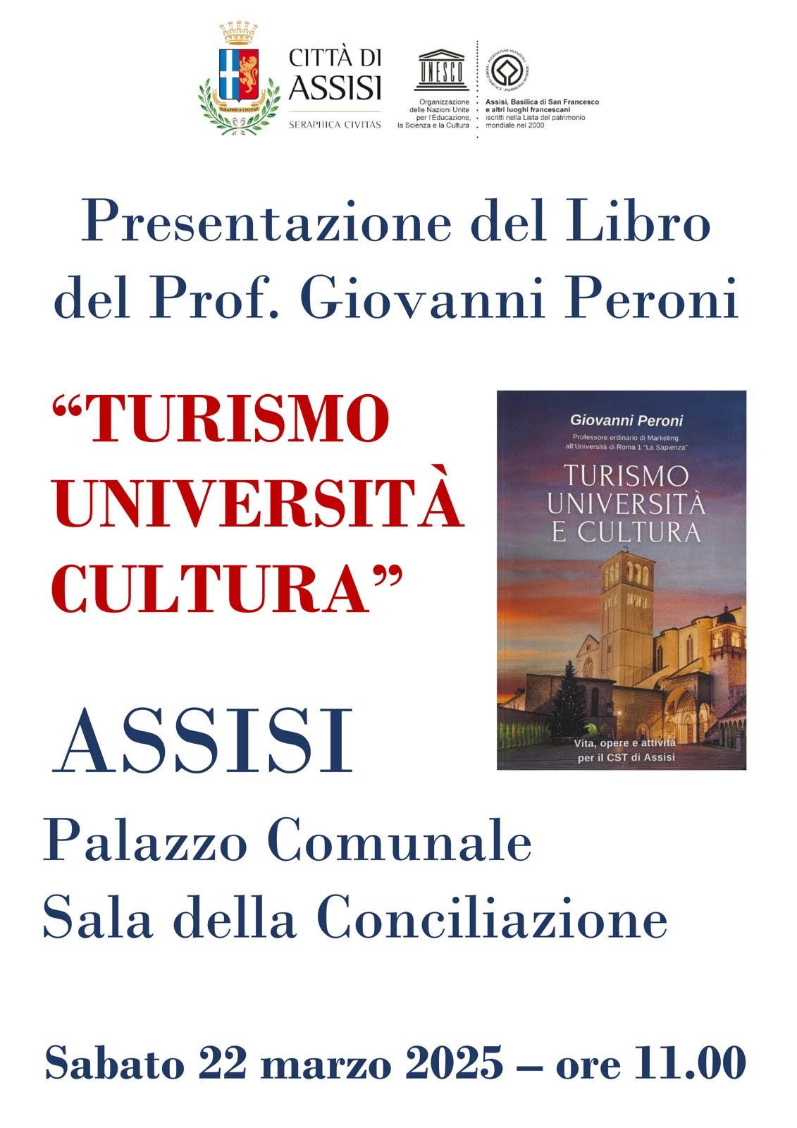 Assisi, 17/03/2025 – Si terrà sabato 22 marzo 2025, alle ore 11.00, nella Sala della Conciliazione del palazzo comunale di Assisi, la presentazione del libro intitolato “Turismo, Università e Cultura” di Giovanni Peroni, professore ordinario di marketing all’Università di Roma 1 “La Sapienza” e direttore del Centro Italiano di Studi Superiori sul Turismo (CST) di Assisi, recentemente scomparso. All’iniziativa porteranno i saluti Valter Stoppini, sindaco f.f. di Assisi, Stefania Proietti, presidente della Regione Umbria, Federico Lasco, direttore generale del Ministero del Turismo, Roberto Rettori, delegato del Rettore dell’Università degli Studi di Perugia per il settore orientamento, tutorato e divulgazione scientifica.