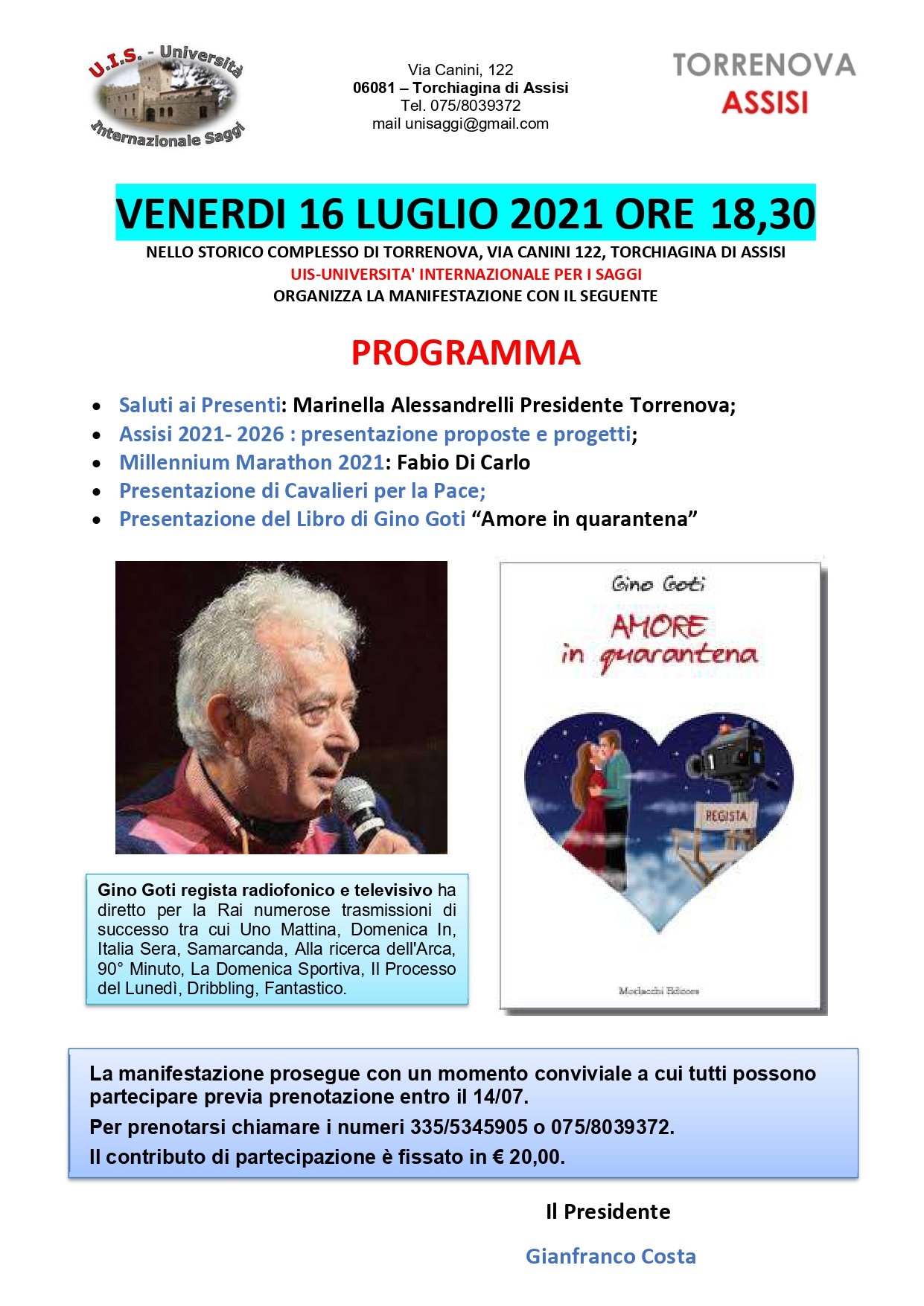 La manifestazione prosegue con un momento conviviale a cui tutti possono partecipare previa prenotazione entro il 14/07. Per prenotarsi chiamare i numeri 335/5345905 o 075/8039372. Il contributo di partecipazione è fissato in € 20,00.
