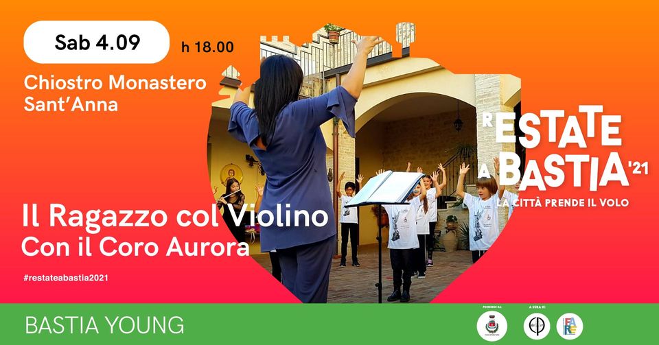 Sabato 4 Settembre alle ore 18.00 presso il Chiostro del Monastero Sant’anna “ Il ragazzo col Violino”. I bambini e i ragazzi delle voci bianche del Coro Aurora – Associazione Corale Città di Bastia. Al Violino Lucia Centomini, al Pianoforte Cristiana Peppoloni, Direttore Stefania Piccardi. È una fiaba per cantare e ballare del poeta Roberto Piumini, con le musiche originali di Andrea Basevi, compositore che ha dedicato molta della sua produzione alla vocalità infantile. Racconti di Sabina Antonelli. Un’opera capace di fondere insieme recitazione, canto e danza. Registrazione obbligatoria nel rispetto delle normative Covid al link bit.ly/IlRagazzocolViolino. Green Pass e documento di riconoscimento per accedere all’evento.