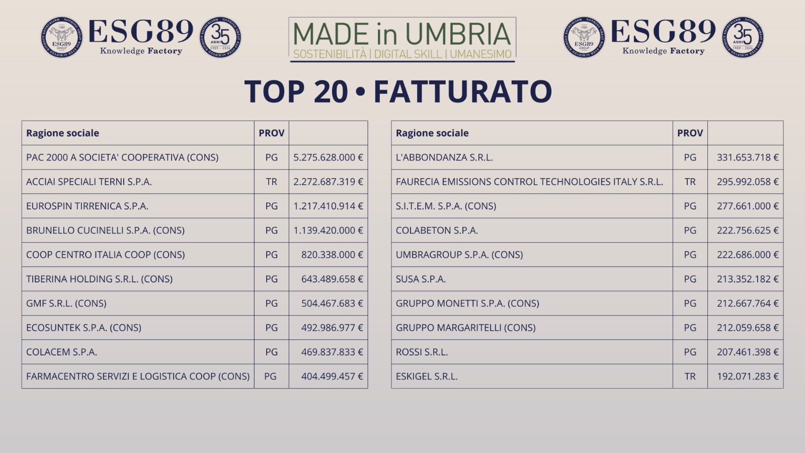 A margine del GLOCAL ECONOMIC FORUM ESG89 – MADE IN UMBRIA che si è svolto a Foligno il 27 e 28 novembre presso l’Auditorium di San Domenico che ha visto coinvolti più di 1200 studenti delle scuole superiori, sono stati presentati i risultati economici delle migliori aziende dell’Umbria.