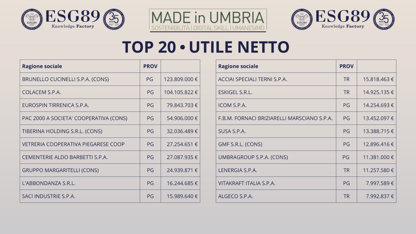 BRUNELLO CUCINELLI SPA svetta in regione per Utile Netto con un robusto risultato: 123.809.000 euro, a seguire COLACEM SPA con 104.105.822. In terza posizione troviamo EUROSPIN TIRRENICA SPA che fa registrare 79.843.703 euro.