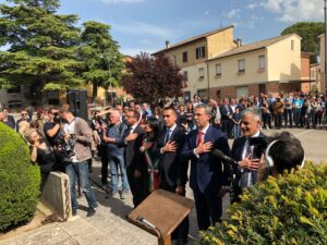 “Oggi siamo qui – ha affermato ancora il sindaco Proietti – per ricordare il nostro concittadino, ma anche per onorare i nostri caduti e soprattutto condannare con forza ogni guerra, ogni spargimento di sangue innocente che inevitabilmente ne consegue. La nostra Costituzione condanna il fascismo e afferma che l’Italia ripudia la guerra. Ed è alla responsabilità delle nostre Istituzioni che, come cittadini italiani, affidiamo, oggi più che mai, il compito di disegnare un futuro di pace, nel nostro Paese e nelle scelte politiche internazionali, condannando senza esitazione ogni strage di innocenti che la guerra porta con sé”.