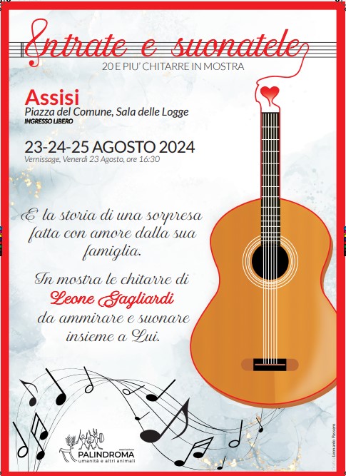 Con l’approvazione della sindaca e il sostegno dell’associazione culturale Palindroma, è stata organizzata una mostra nella storica sala delle Logge, in piazza del Comune di Assisi. L’ evento ha visto la partecipazione di numerosi visitatori che, per tre giorni, hanno avuto l’opportunità di ammirare e, soprattutto, suonare liberamente le chitarre della collezione di Leone.