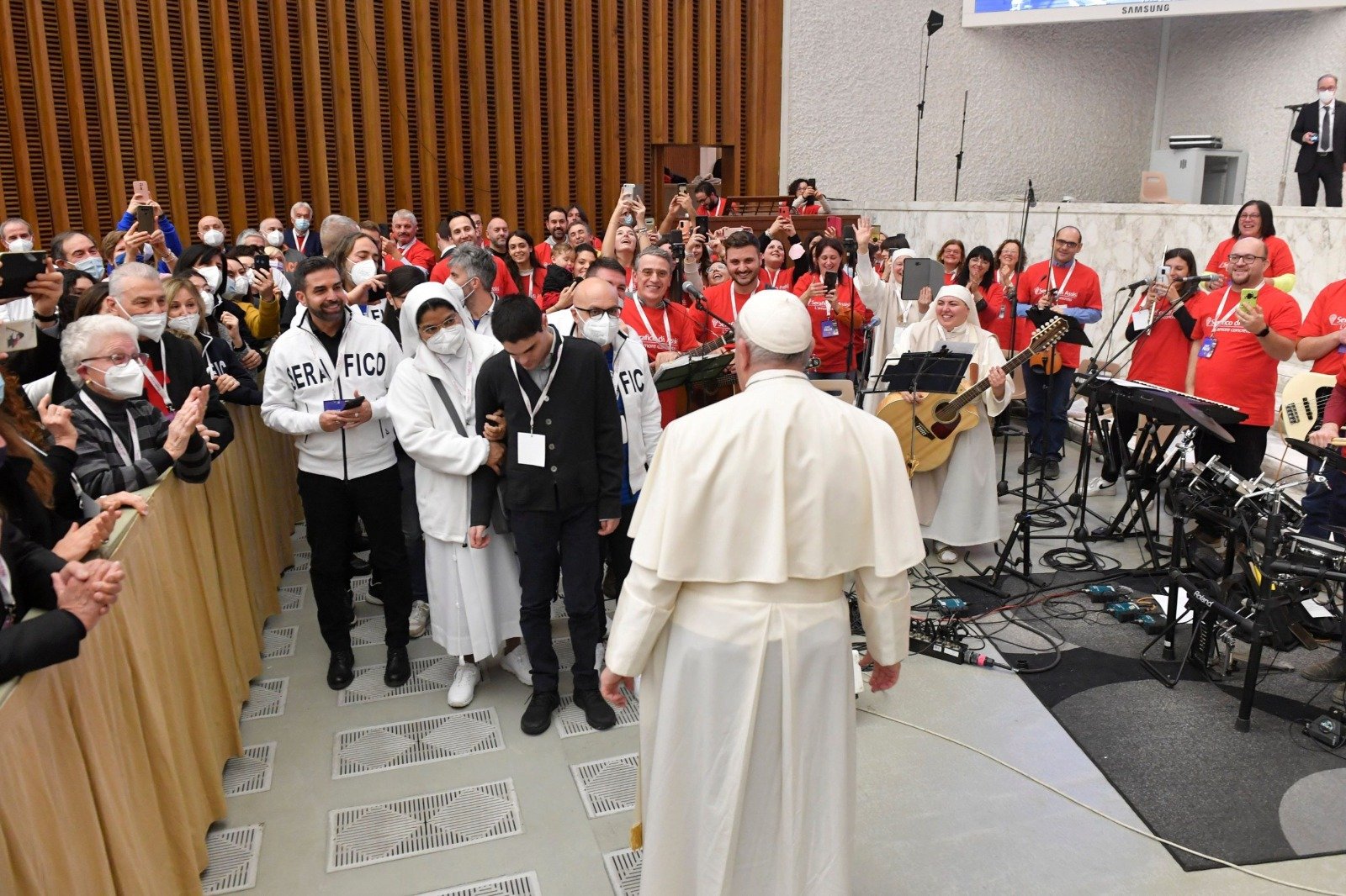 Papa Francesco ha ricordato la visita del 2013 quando a pochi mesi dall’elezione al soglio pontificale venne al Serafico a toccare “le piaghe di Gesù” e abbracciò uno per uno tutti gli ospiti.