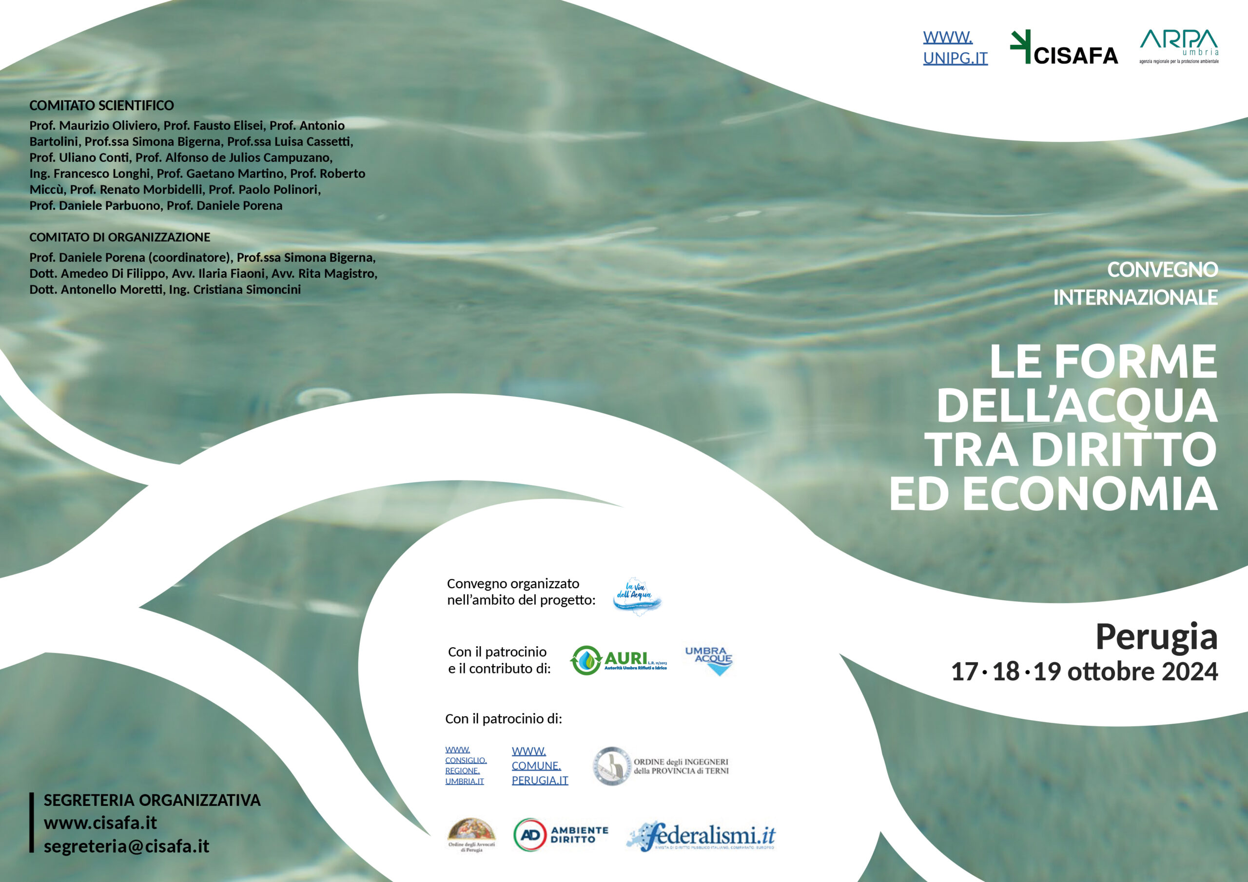 Perugia, 15 ottobre 2024 – È dedicato all’acqua, alla sua disciplina e ai suoi impieghi, il Convegno internazionale “Le forme dell’acqua tra diritto ed economia” in programma il 17, 18 e 19 ottobre 2024 a Perugia, organizzato da CISAFA, il Centro Interistituzionale di Studi e Alta Formazione in materia Ambientale, costituito dall’Università degli Studi di Perugia e da Arpa Umbria.